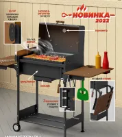 В комплектации: столики, полки, термометр, дымовая труба, решетка для барбекю, кочерга, совок.