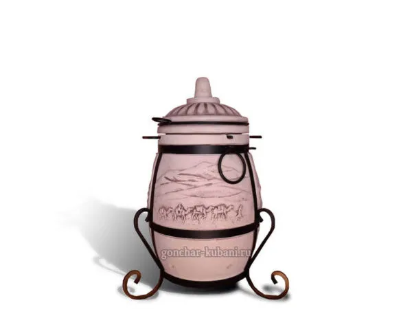 Добротный тандыр – та самая отправная точка для вас и ваших дорогих гостей. “Оазис” из шамотной глины добавит немного экзотики в египетском стиле. Целый сюжет разворачивается на его стенках, толщина которых составляет целых 5 см! Центральной фигурой является, конечно же, древний сфинкс на фоне пирамид, с другого бока плетется вереница кочевых верблюдов во главе с погонщиком.